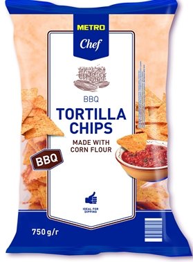 free METRO Chef Tortilla Chips BBQ are crispy tortilla chips with spicy barbecue flavor. They do not contain glutamate. Being made from wheat flour, the fries go very well with sauces and are also suitable as a base for nachos. One bag of the tasty METRO Chef BBQ Tortilla Chips contains 750 g. The amount corresponds to 25 individual servings of 30 g. Mexican-style fries can be served in pubs as a cold appetizer.